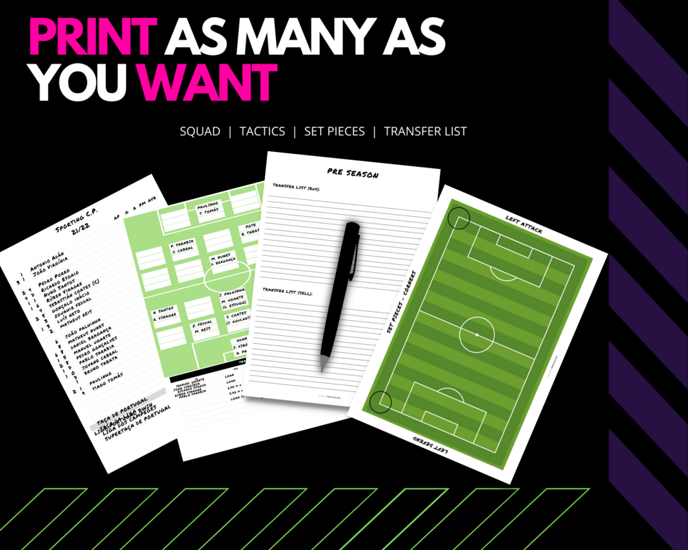 You'll get 1 ZIP file for A4 prints, including squad, tactical, set pieces and transfer list sheets in English and Portuguese.